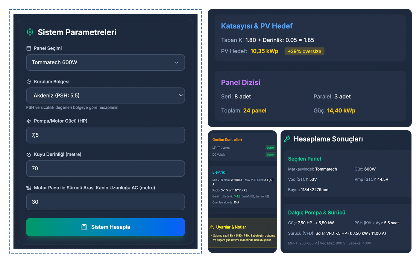Karmaşık hidrolik hesaplarla uğraşmadan, sadece pompanızın HP değerini girerek ideal solar sistemi saniyeler içinde oluşturun.